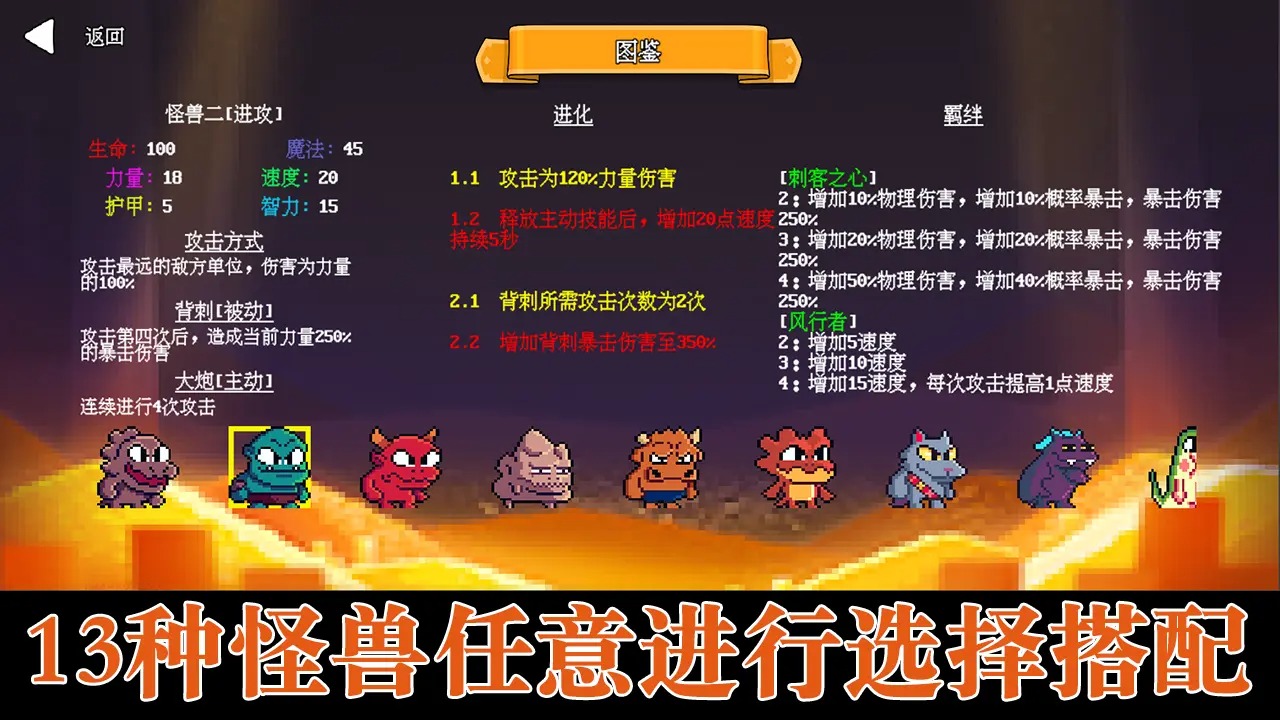 1、玩家可以通过选择不同的怪兽搭配出不同的阵容!不同的阵容可以组合成不同的羁绊