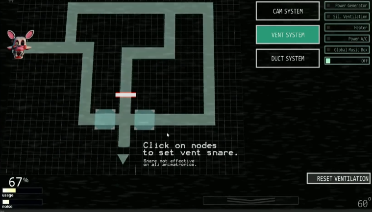 11.老奇卡(WitheredChica):可以在监视器的通风管看到她,可以通过关闭通风管口和通风口陷阱来防御,当被防御了会重置状态路线。如果进入安保室则会卡在上面的通风口,样子有点滑稽,有趣的是,当卡在通风口的时候除了曼果除外的所有玩偶都无法出来跳杀你,类似于抢人头,脸白的话一整局都不会跳杀你。