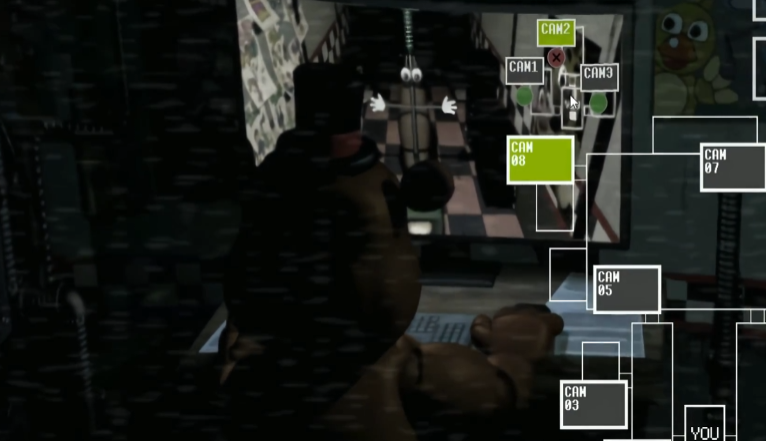 5.玩具费莱迪(ToyFreddy):他会在配件间玩电脑,你需要在开局的时候帮他防“拥抱先生”,他的游戏有三个门,你要盯着“拥抱先生”的位置并他的电脑上打x,如果你看到他消失了并且电脑上显示GAMEOVER的话,那么你在下一次看监控的时候就会跳杀你。