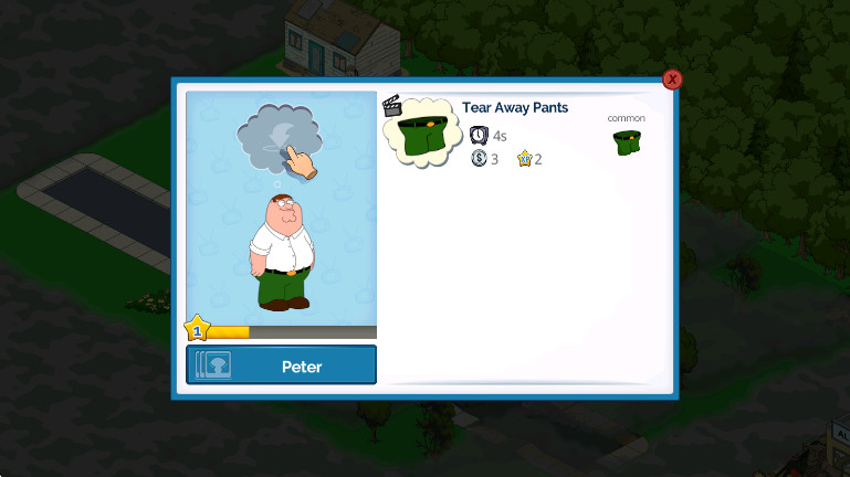 3、随着游戏推进,玩家可解锁大量脑洞大开的趣味服装,自由装扮角色:比如化身“美人鱼彼得”畅游夸哈格湖,Quagmire穿上比基尼大跳热舞,或是兰博造型的洛伊丝手持重机枪霸气登场,每一套造型都充满恶搞精神,乐趣十足。