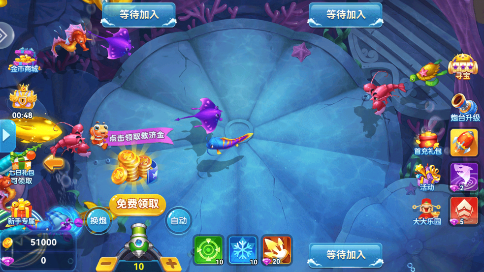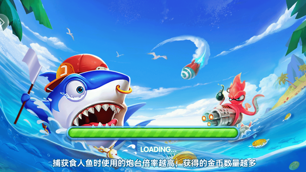 炮台射击:玩家通过消耗金币来控制和发射炮弹,射击屏幕中游动的各类鱼群。