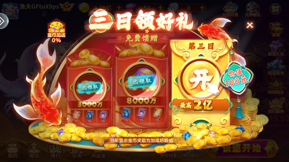 炮台套装免费送:炮台翅膀免费送,不花钱也能称霸渔场。