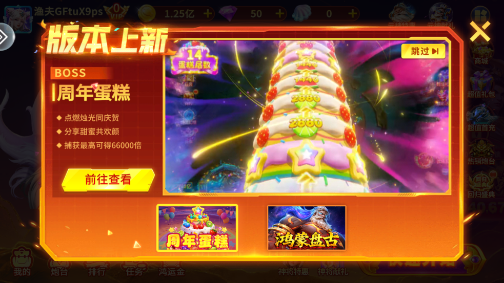 超高倍率爆金:超高倍率炮台,超好爆金,一炮上亿不是梦。