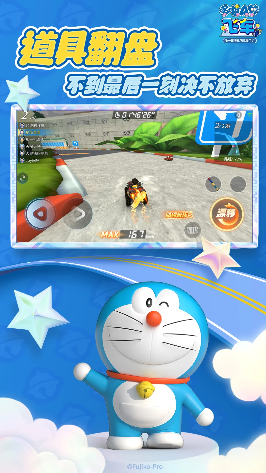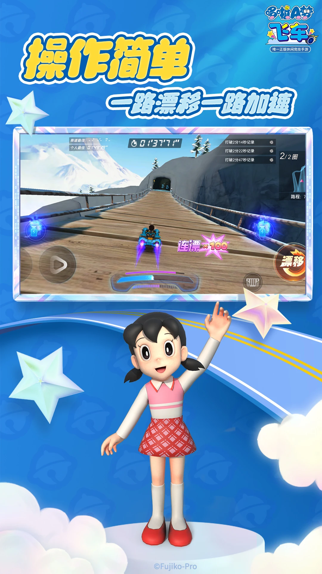 哆啦a梦飞车是一款融合经典动漫IP与热血竞速玩法的多人在线赛车手游。游戏以藤子·F·不二雄笔下人气角色为核心,哆啦A梦、大雄、静香、胖虎、小夫等原著经典人物悉数登场,化身个性赛车手,陪你开启一场充满童趣与速度的奇幻竞速之旅!
