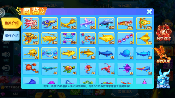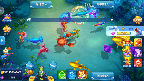 5、游戏提供多种技能(如冰冻、锁定、狂暴等),助你高效捕获高分鱼群,提升爆金收益。