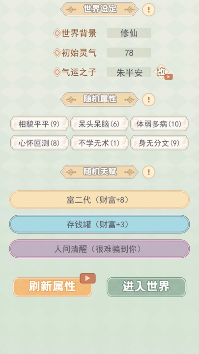 2、每一次穿越都是一次全新冒险——世界背景、气运之子身份、初始属性、天赋技能、人设性格均由系统随机生成,确保每次开局都充满新鲜感与未知惊喜。