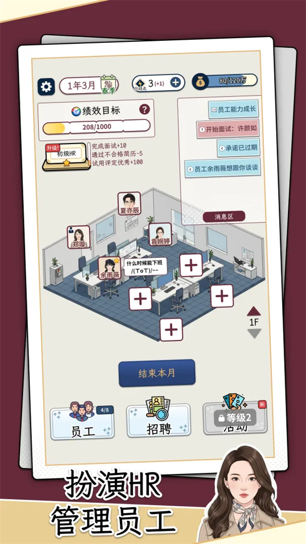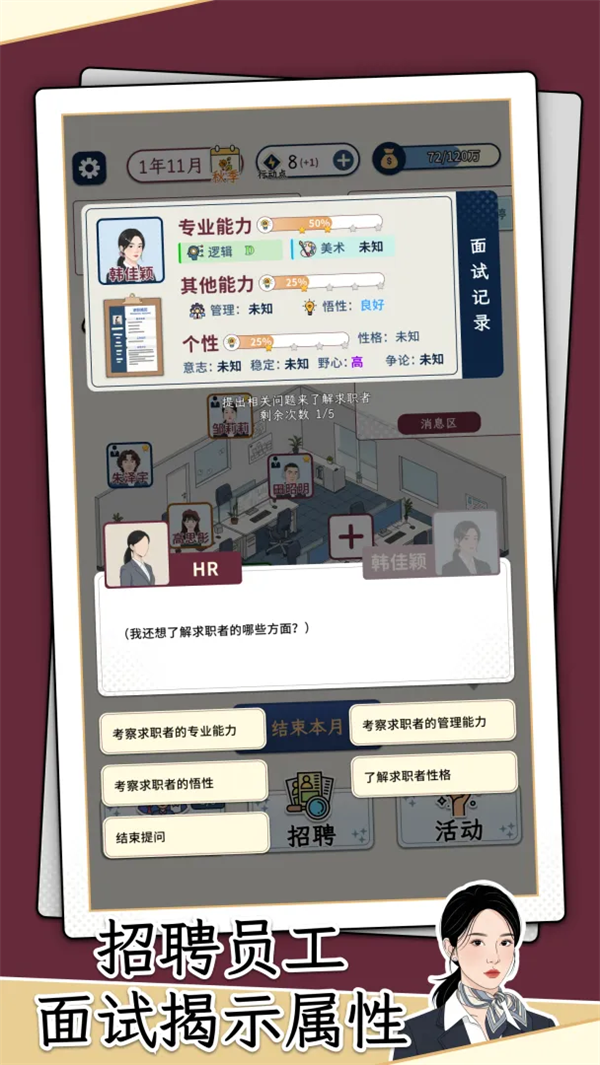 HR模拟器是一款模拟经营类手游,玩家将化身负责员工招聘与团队管理的人力资源主管,从筛选简历、招募人才开始,逐步搭建高效团队,助力公司稳步发展。游戏真实还原了HR日常办公中的各类场景与事务,面对海量简历,你需要细心甄别、选拔优秀人才;录用员工后,还要妥善处理不同员工的各类需求,从容应对明面上的突发状况与暗地里的人际博弈,只有合理决策、妥善处理,才能让团队不断发展壮大。喜欢模拟经营玩法的玩家,不妨下载一试!