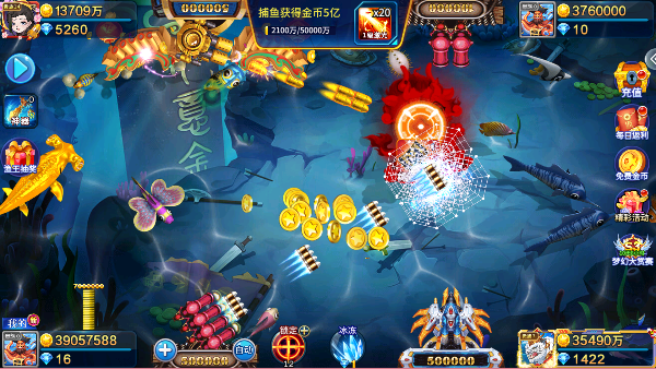 游戏不仅保留了熟悉的“经典场”“比赛场”等多场景玩法,还创新加入高倍率炮台系统(如100倍、500倍、万倍巨炮)、随机BOSS觉醒事件以及真人实时联机对战,支持四人同屏协作或竞技,策略与手速并重,乐趣翻倍!