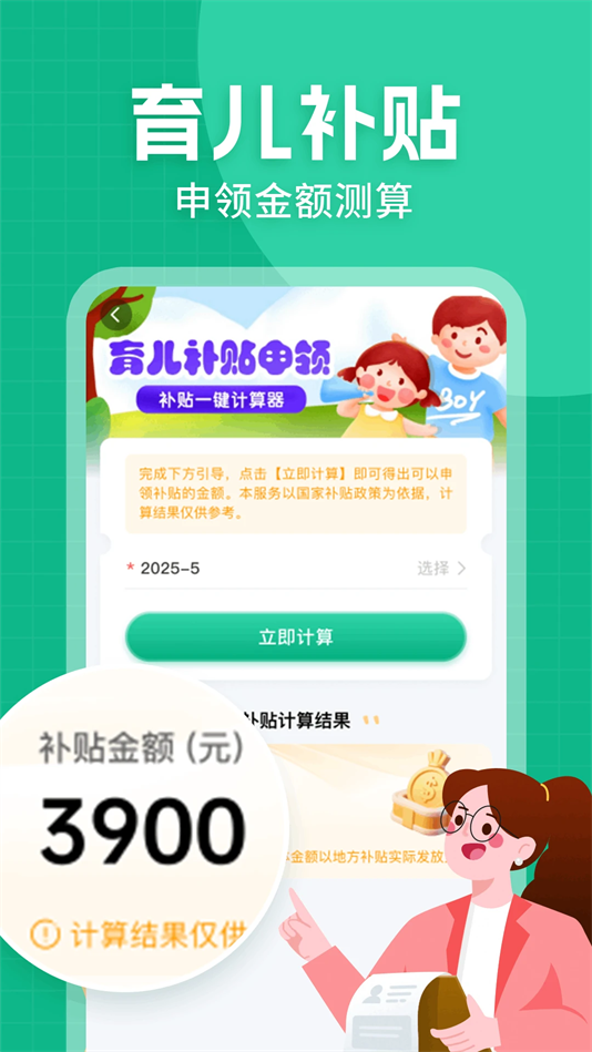 4、育儿补贴测算:基于家庭实际情况,智能分析并精准测算可申领的育儿补贴金额,明细清晰,补贴到账心中有数。