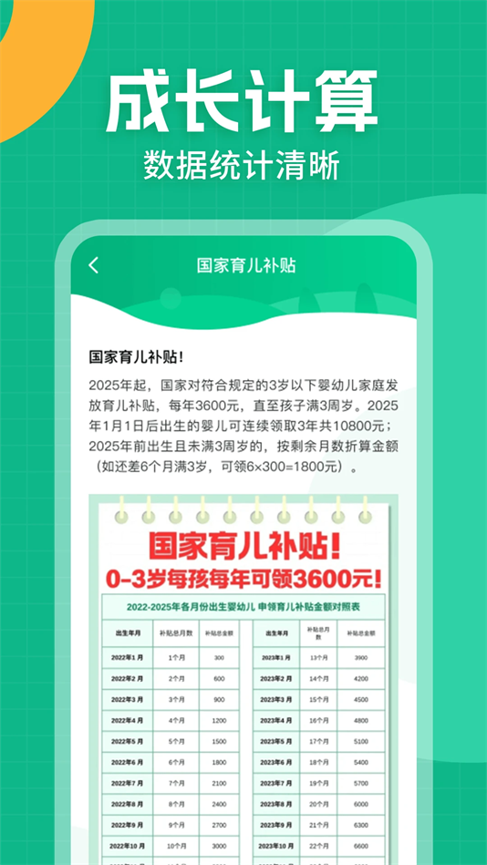 3、成长计算:智能记录宝宝成长数据,可视化呈现身高、体重、发育进度等关键指标,成长轨迹一目了然。