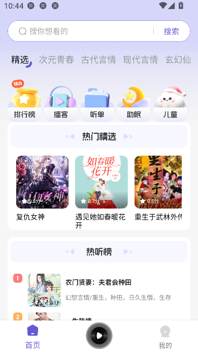 1、打开App后,进入首页即可看到清晰的内容分类。你可以根据兴趣轻松筛选:点击任意分类,系统将为你呈现该题材下的精选有声书,满足不同口味的听书需求。