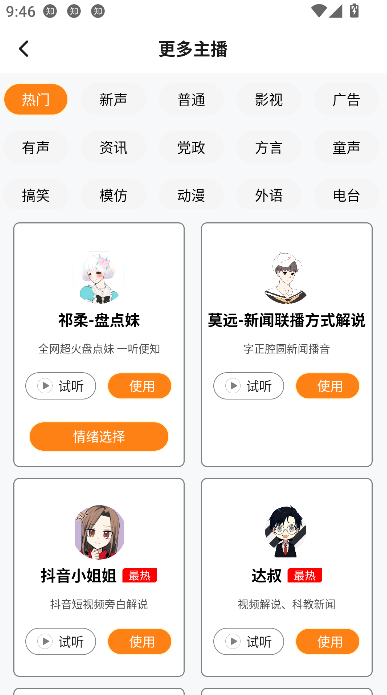 1、南瓜配音内置海量高品质AI音色库,涵盖男声、女声、童声、方言、外语等多种类型,总数超百种,并持续更新
