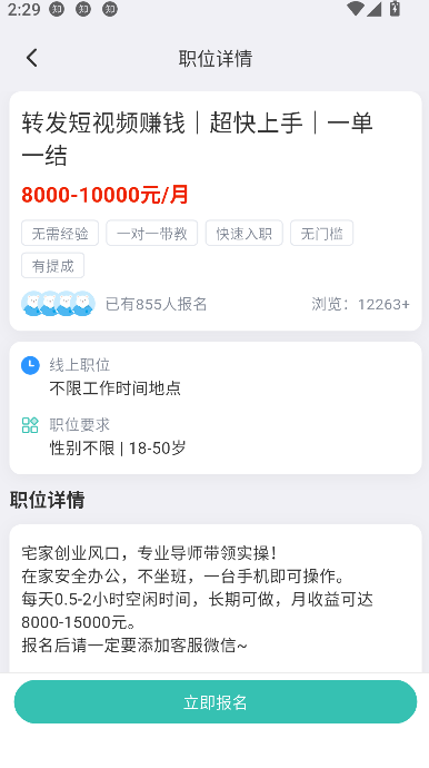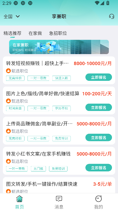 享兼职平台汇聚多种行业、多样类型的兼职机会,涵盖校园勤工俭学、线上推广、内容审核、问卷调查、地推拉新、家教辅导、直播助理、短期工、小时工等丰富岗位,满足不同人群的时间安排与技能特长。所有招聘信息均经过严格审核,确保岗位真实、薪资透明、无中介套路,杜绝虚假信息,让用户安心求职、放心上岗。享兼职,让每一份努力都不被辜负。立即下载,轻松开启你的兼职赚钱之旅。