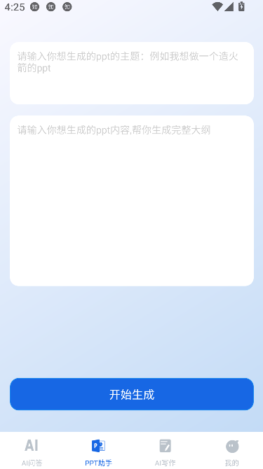 AI万能搜索支持跨平台、跨领域的深度搜索,快速获取最新资讯、行业报告、学术论文等各类信息,为用户提供最前沿的知识储备。内置AI助手能够理解复杂问题并提供精确答案,无论是创意灵感还是技术难题,都能在这里找到解决方案。只需输入简短的主题关键词,即可自动生成结构完整、内容丰富的PPT文件。无论是商务汇报、学术演讲还是日常教学,都能轻松搞定。