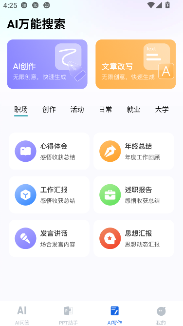 AI万能搜索App是一款集多功能于一体的高效内容创作辅助工具,专为满足现代用户在媒体写及营销广告等多领域的多样化需求而设计。通过深度AI全网搜索与智能对话功能,该应用致力于提供全面的创作支持,助力用户轻松应对各种任务挑战。