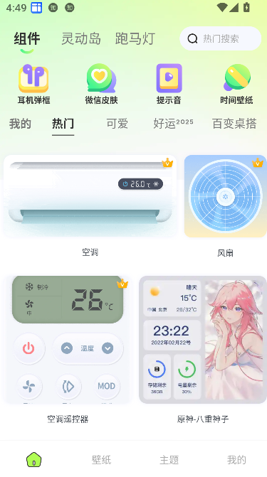 万能小组件美化App是一款功能强大、资源丰富的安卓桌面美化工具,集动态壁纸、主题图标、智能小组件、灵动岛、跑马灯等潮流元素于一体,致力于为用户提供高度自由化、个性化与视觉美感兼具的手机桌面体验。