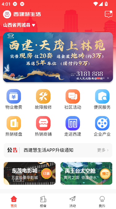 西建慧生活应用采用简洁直观的界面设计,涵盖【首页】【楼盘】【活动】【我的】四大功能模块,操作便捷,服务全面,以“让居住更美好”为使命,通过智能化管理与精细化运营,推动传统物业服务向“智慧社区”转型升级,全面提升业主满意度与社区生活品质。整合家政保洁、快递代收、二手置换、宠物托管等多元化生活服务,足不出户享受便利,现在就下载西建慧生活APP,开启您的智慧社区新生活。