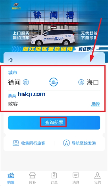1、打开徐闻港购票平台App,进入首页后点击【购票】界面,选择出发城市与目的地、票种类型(如小车票、散客票等),点击【查询船票】,即可查看实时余票及航班信息;