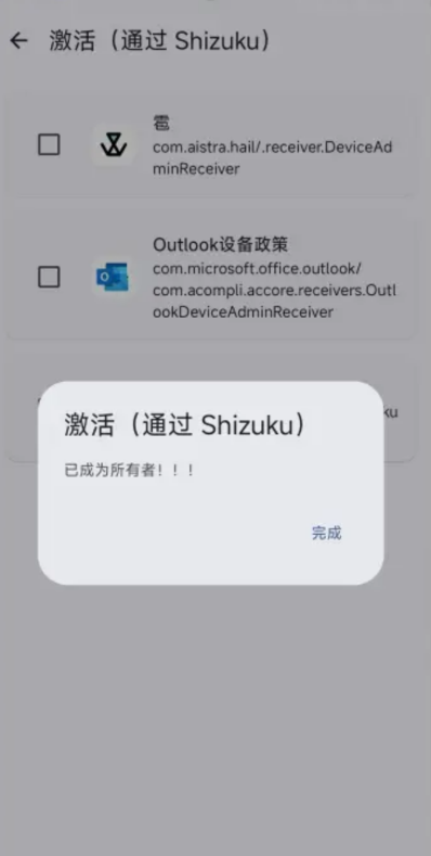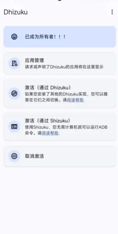 执行成功后,Dhizuku将被激活为设备所有者,获得必要权限以实现系统级功能调用。