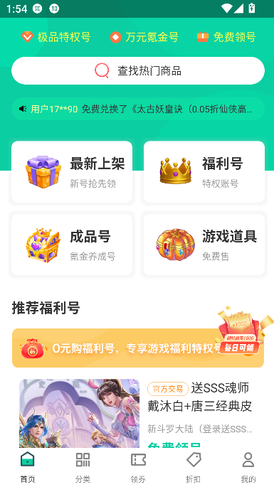 1、打开1点游戏盒App,首页即为您智能推送各类高性价比折扣账号与限时福利账号,涵盖满级VIP号、氪金成品号、首充号、特权服账号等,多种优惠类型轮番上线,助你以极低成本畅玩高端游戏体验。