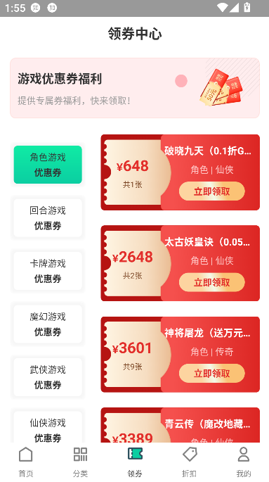 4、除了免费账号,平台还提供海量高额满减充值代金券与专属折扣礼包,覆盖主流热门游戏。领取后可在充值时直接抵扣,享受低至0.1折的惊喜优惠,大幅降低氪金成本,让游戏养成更轻松、更划算。