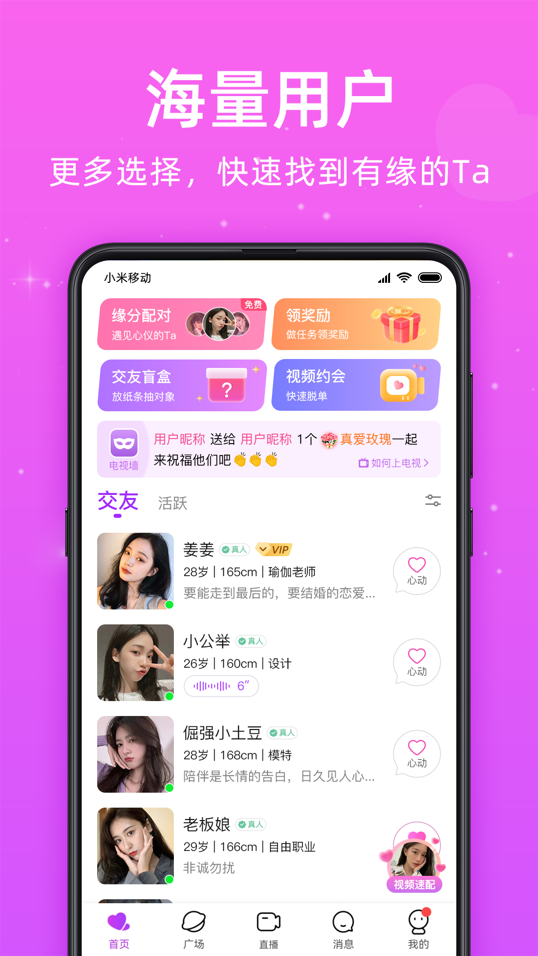 1、支持“缘分配对”与“视频速配”双重模式,系统基于地理位置、年龄、职业、兴趣爱好等多维度择偶条件,智能推荐高度契合的异性用户。匹配成功后即可一键发起聊天,沟通无障碍。部分活跃用户实现消息“秒回”,显著提升互动效率,让心动不再等待。