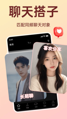 1、基于您的兴趣标签、性格特点和聊天偏好,系统智能推荐“同频共振”的聊天对象,让每一次对话都从“有话可说”开始。