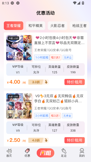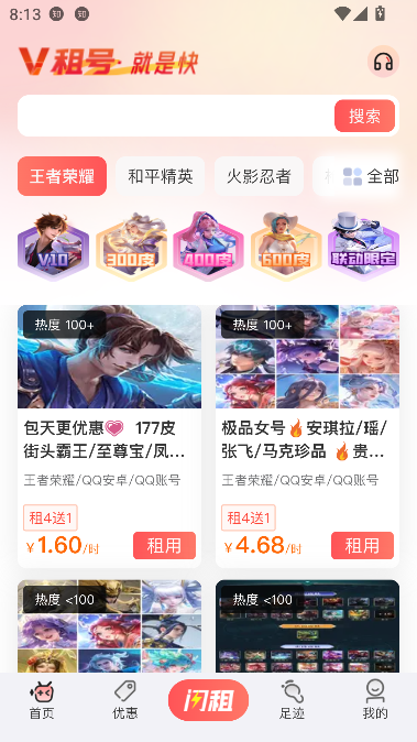 V租号App是一款专注于游戏账号租赁的高品质服务平台,致力于为玩家提供安全、可靠、便捷的租号体验。无论你是追求稀有皮肤、全英雄体验,还是想快速上分、畅享高端账号,V租号都能满足你的需求。