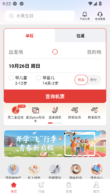 2、进入App首页,输入出发地、目的地和出行日期,即可快速查询国内国际航班信息,实时比价、在线购票,特价机票智能推荐,让出行更省心省力。