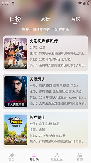 2、底部导航栏集成多项实用功能模块,包括每日番剧更新表、实时人气排行榜、追番列表等,一手掌握最新播出动态,轻松管理你的追番计划。
