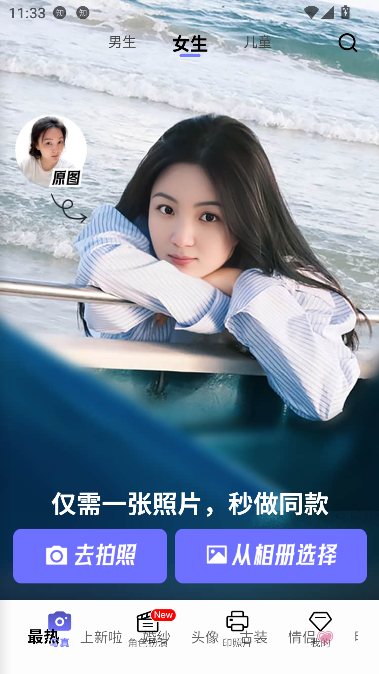 3、选定喜欢的模板后,点击“拍同款”,上传一张清晰的人像照片。AI将自动完成智能换装、妆容匹配与背景融合,几秒内生成专属大片,效果自然逼真,惊艳全场!