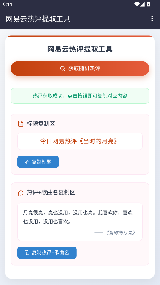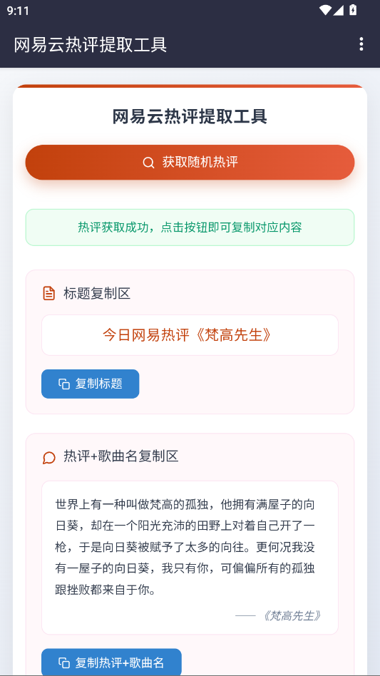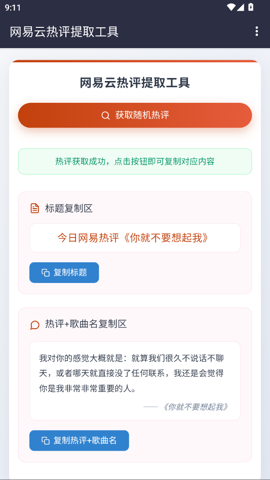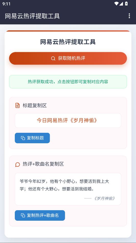 只需一键操作,即可随机抓取高质量热评,界面清晰划分标题与正文区域,并支持分别复制,省时省力,满足你对效率与便捷的双重需求。