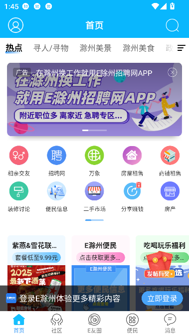1、打开E滁州App,首页即可看到【招聘网】入口(通常位于首页推荐板块或服务列表中),点击进入滁州本地招聘专区。