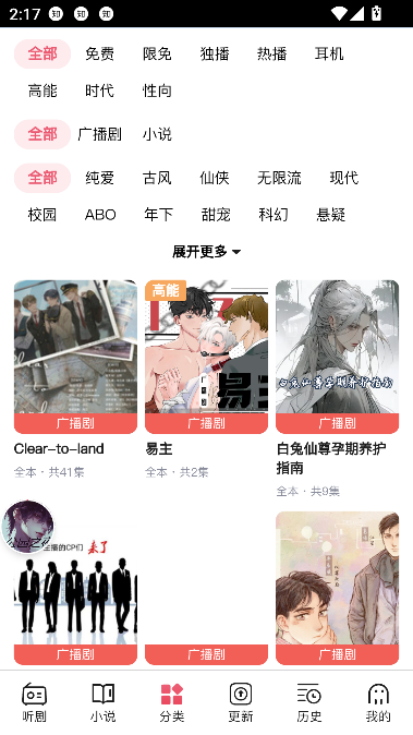 2、进入【分类】频道,支持按纯爱、古风、仙侠、校园、现代都市、科幻、悬疑、年下、BL/GL等多种题材进行浏览与筛选。还可按人气、更新时间排序,快速锁定符合你口味的精品剧集。