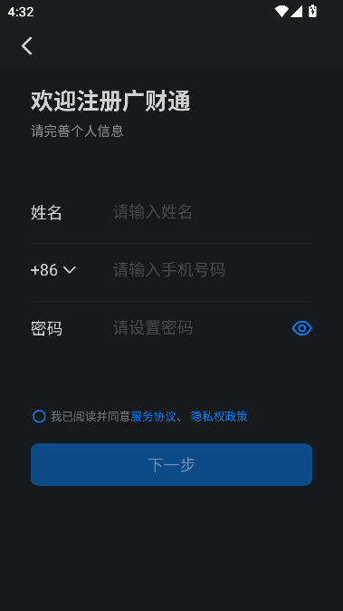2、输入姓名和手机号点击下一步
