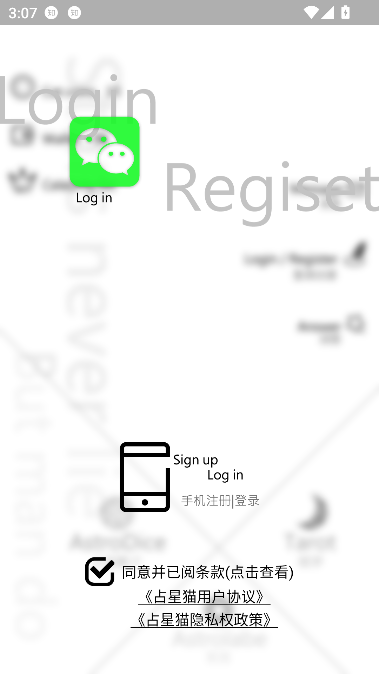 1、下载并打开《占星猫》App,首次进入时请仔细阅读并勾选同意《用户协议》与《隐私政策》,确保服务正常启用。随后选择【手机注册】方式开启账号创建流程。