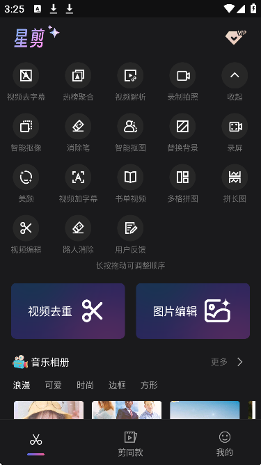 1、启动星剪APP后,首页即提供丰富的 视频剪辑 与 图片编辑 工具入口。根据你的需求,一键进入对应功能模块。