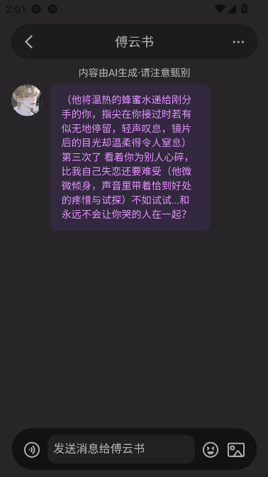 3、所有AI角色,无论是校园学长、霸道总裁,还是顶流爱豆,全部免费开放!应用内无任何隐藏收费、无会员墙、无道具付费,真正做到纯粹陪伴,安心使用。