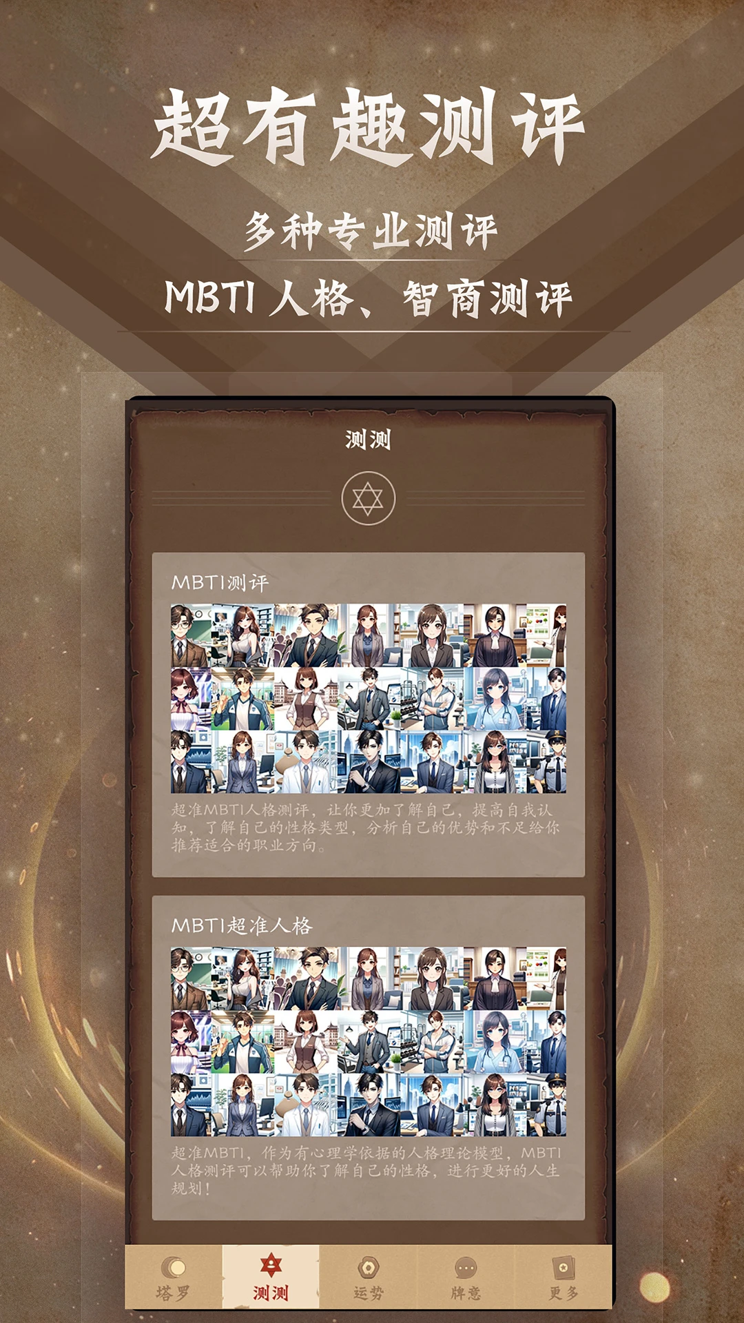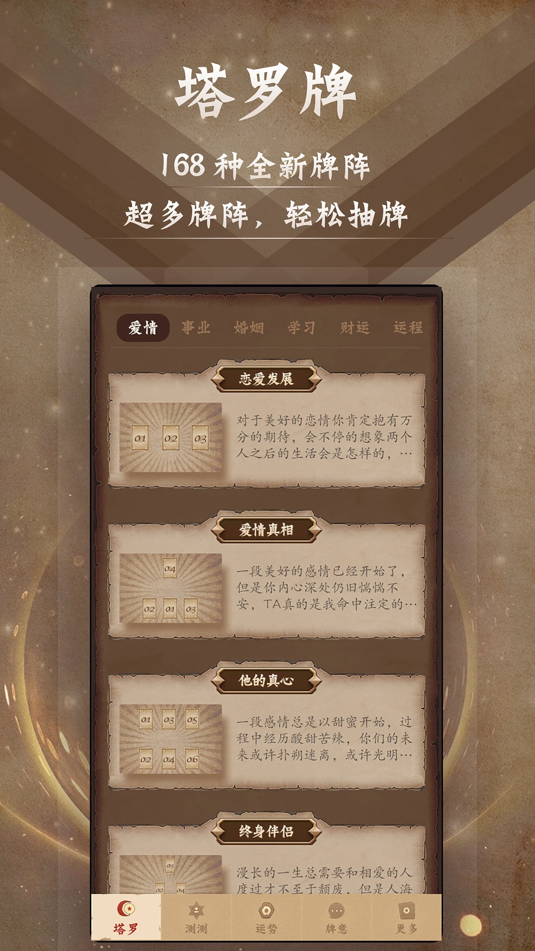 塔罗牌占星是一款深度融合古老玄学智慧与现代数字技术的运势测算应用,致力于为用户带来专业、精准且富有启发性的塔罗占卜与星座运势服务。在这里,塔罗不仅是占卜工具,更是通往自我觉察与内在智慧的桥梁。