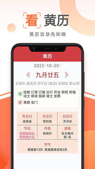 4、融入传统习俗:内置黄历查询,宜忌、五行、节气一目了然,尊重长辈生活习惯。