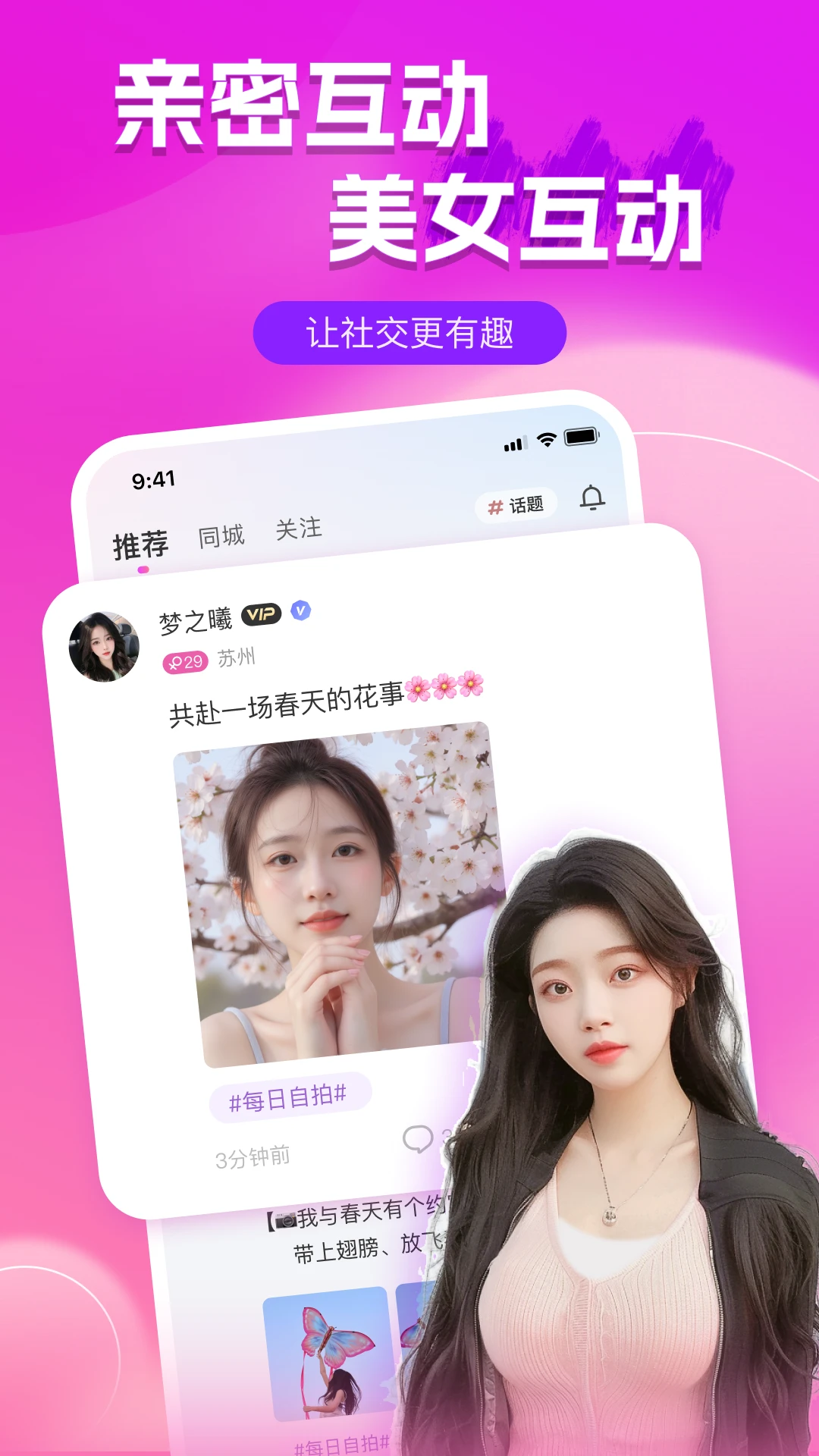 2、提供“附近”“同城”“在线”多维度筛选条件,系统智能推荐当前活跃的本地用户;搭载海量推荐引擎,每日为你推送新鲜面孔,打破社交壁垒,大幅提升搭讪与匹配机会;无论通勤路上、午休片刻,还是夜晚闲暇,都能轻松找到“就在你身边”的那个TA。