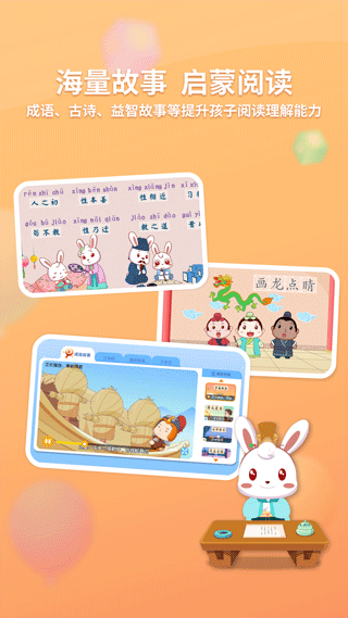 3、除识字外,还提供**古诗诵读、成语故事、寓言精选、《三字经》**等经典国学内容,从小培养文化素养,拓宽知识视野。
