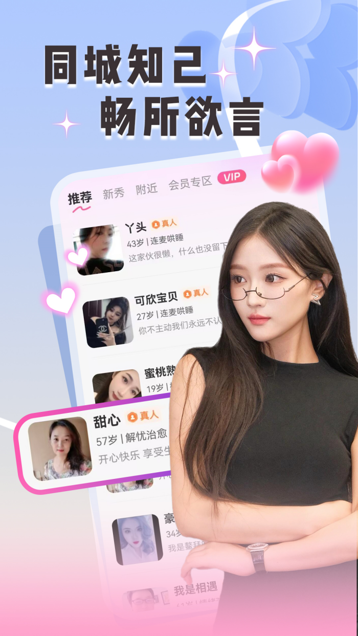 附近两性约聊app是一款主打“同城异性速配”“即时语音/视频聊天”的社交软件,在这里你可以通过定位功能推荐周边用户,实现快速交友或情感陪伴。附近两性约聊app安全可靠,所有人都是实名的,想要交友的小伙伴快来下载吧。