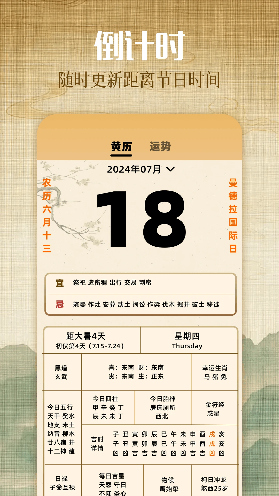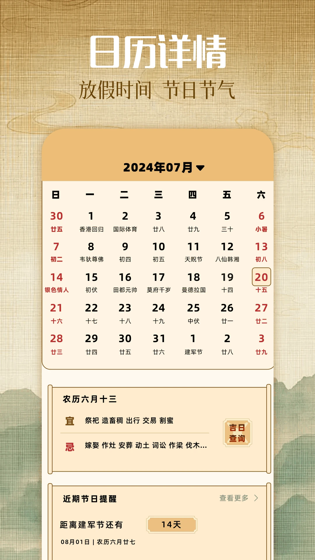 3、支持公历、农历、节假日、二十四节气等多种日历体系自由切换与叠加显示。无论您关注传统节庆、农事安排,还是现代日程规划,都能准确查询、一目了然。