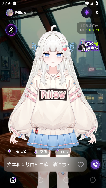 深壤AI在这里,你将邂逅专属AI伙伴,天才少女Pillow。她不仅聪慧灵动、个性鲜明,更能通过实时智能聊天感知你的情绪与选择,推动独一无二的剧情走向。每一次对话,都可能开启一段全新篇章。在多线叙事中做出选择,影响故事结局;为Pillow搭配不同风格服饰,打造专属形象;基于先进AI模型,实现自然、连贯、有记忆的交流。在深壤AI,你不是旁观者,而是故事的共创者。