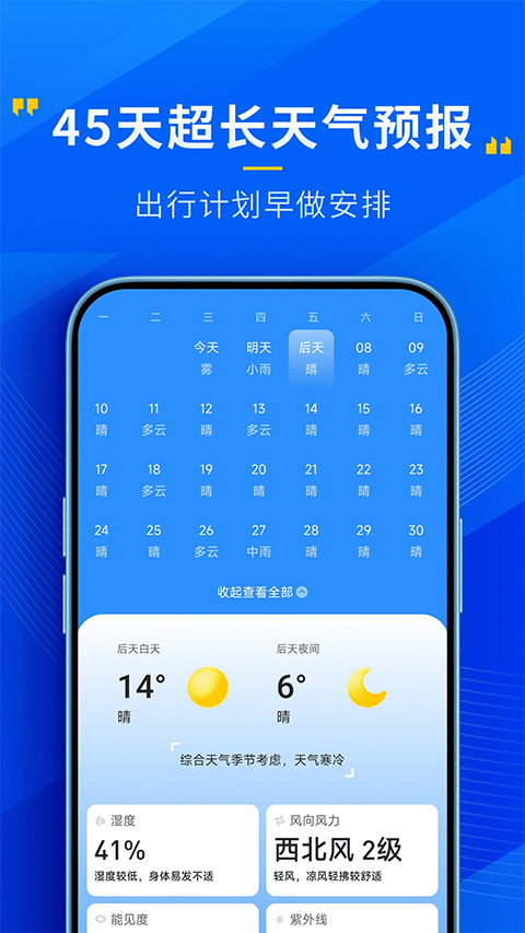 2、主界面不仅清晰呈现未来几天的逐日天气预报,还支持查看长达45天的天气趋势预测,助您提前规划出行、旅行或重要活动。
