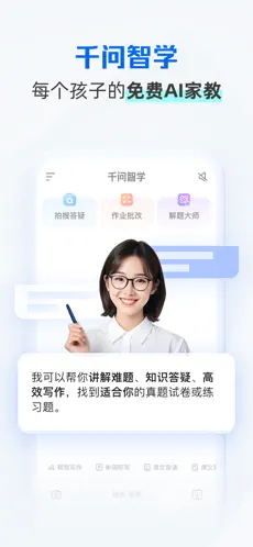 千问智学是阿里旗下AI教育应用,你的专属免费AI家教“小千老师”,基于通义大模型,理解力强、响应快、答案准,根据你的薄弱点智能推荐练习,越用越懂你,专注学习体验,家长放心,学生安心,让每个孩子都拥有一个随时待命的AI家教,把辅导班搬进手机里!立即下载千问智学,开启高效、轻松、免费的智能学习新方式!小千老师,不止会答题,更会“教”你学习。