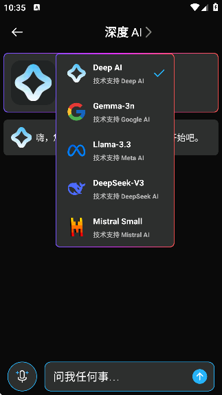 《深度AI》官方版深度集成多款全球领先的大型人工智能模型。你可以根据具体任务需求,灵活切换擅长不同领域的AI引擎——无论是逻辑推理、数据分析、创意写作还是专业咨询,都能精准匹配你的应用场景。只需输入简要指令,深度AI 即可为你生成逻辑严谨、表达清晰、内容专业的高质量方案,大幅提升学习与工作效率。