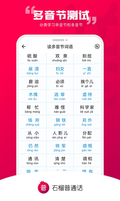 石榴普通话为你提供专业、系统、完全免费的学习体验,是学生、教师、播音爱好者及职场人士提升普通话水平的理想之选!无论你是备战普通话等级考试,还是希望改善方言口音,石榴普通话都能助你轻松开口,自信表达!