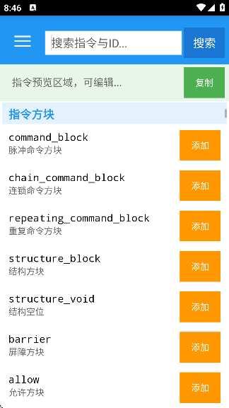 我的世界指令盒子是一款专为MC玩家打造的实用辅助工具,内置海量常用指令库,无需手动输入——只需在指令库中查找、一键复制,甚至支持批量复制多条指令,操作简单高效,大幅节省时间。无论是新手入门还是老玩家进阶,都能轻松调用命令方块、生成物品、传送坐标等操作,显著提升游戏效率与创造乐趣!